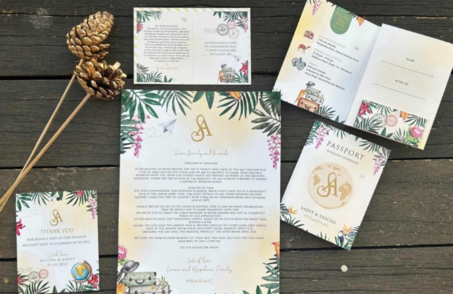 Elevate your celebration with cohesive details—welcome letters, itineraries, signboards, bags, boxes, and more.